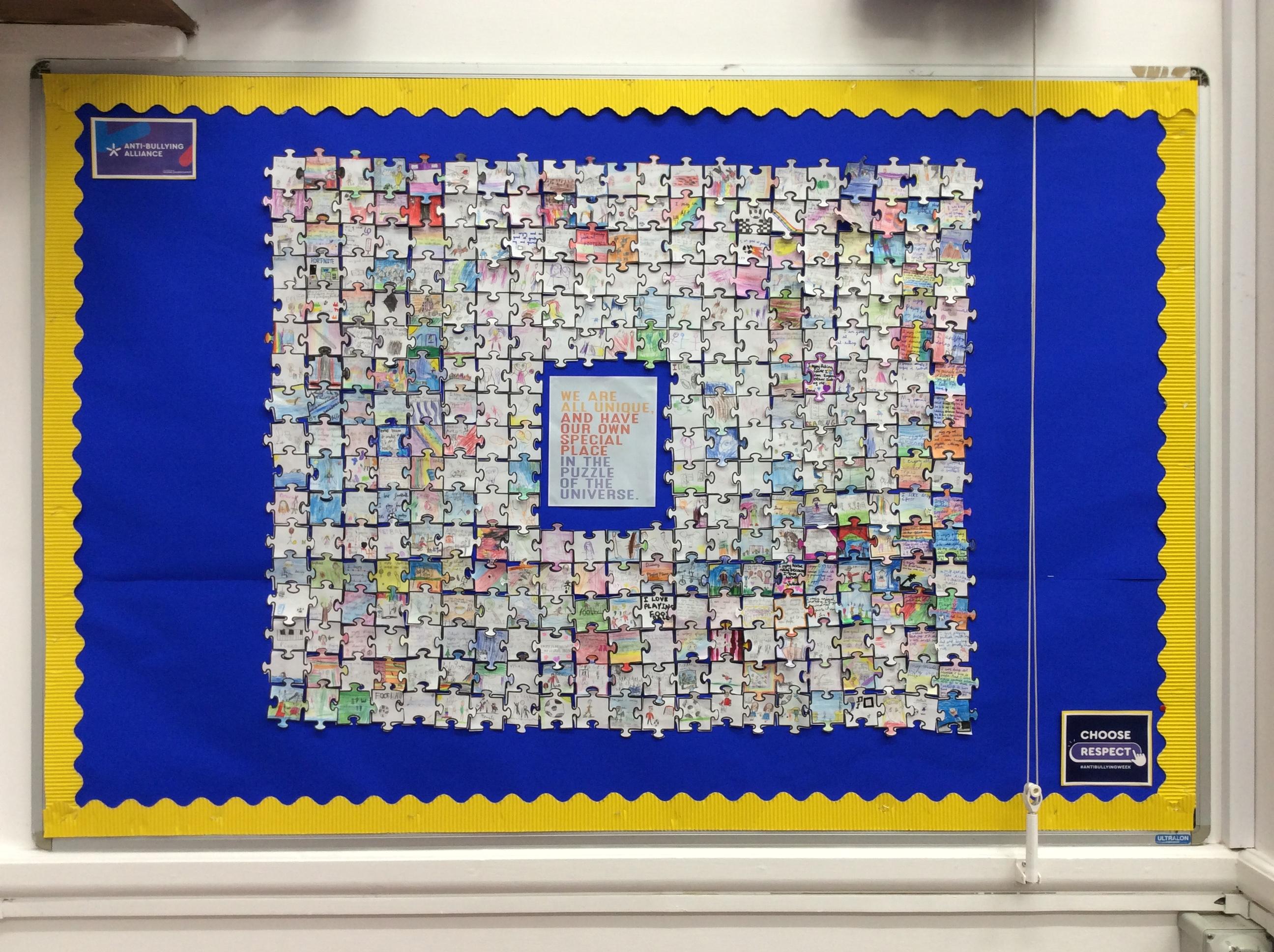 As part of our work on Anti-Bullying this week, each child drew their interests on a puzzle piece. They added it to a whole school collage to represent the many individual and unique talents that make up the picture of our school family.