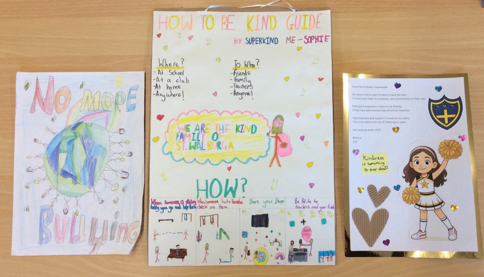 Children were given the opportunity to design posters to display around the school to raise the profile of Anti-bullying and remind us to be kind in all areas of school. The Wellbeing ambassadors went through all the colourful entries to decide on a Key Stage 1 and a Key Stage 2 winner. Well done to Elisia 2NW, Sophie 4CM and Esme 5JC for creating the winning posters.